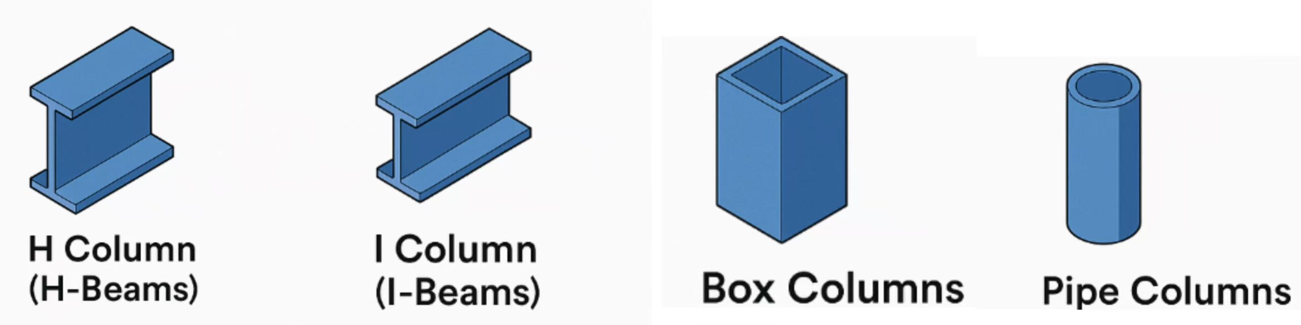 Steel tube columns and pipe columns are versatile and often used in bridges, towers, or columns in a building that require hollow structural supports. Their cylindrical design offers high resistance to buckling. Box columns, on the other hand, are square or rectangular, often used where both strength and aesthetics are important.